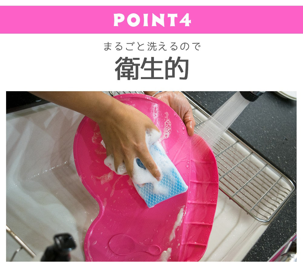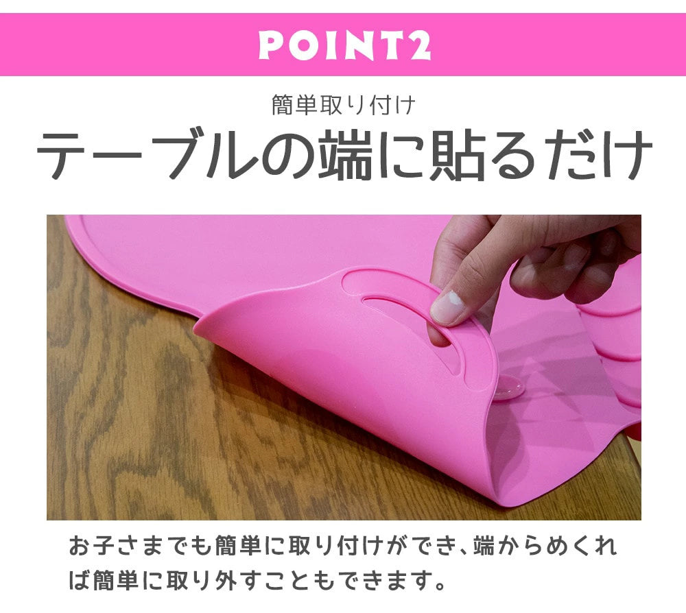 - 食品衛生法規格に適合した安全性の高いシリコン素材を採用した、食べこぼしをキャッチするポケット付きのお食事マットです。