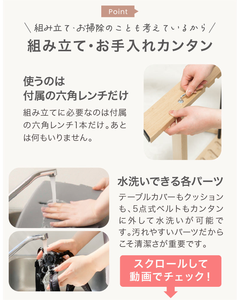 ●成長やテーブルの高さに合わせ、座板と足置き板の高さを調節可能(9段階)